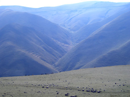 山の縁を、列になってゆっくりと進んでゆく、牛たち。