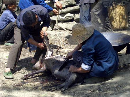 急所を刀で一突きされ、生命を絶たれた二頭の豚。